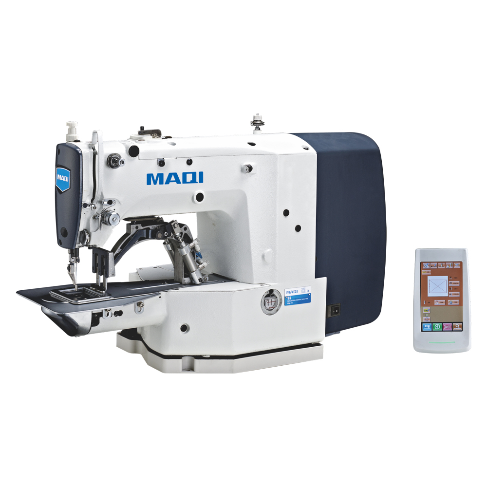 Máquina Presilladora de doble pespunte, costura recta electrónica programable con 87 diseños de presillas predeterminados, motor integrado al cabezal, panel de control y corte de hilo.