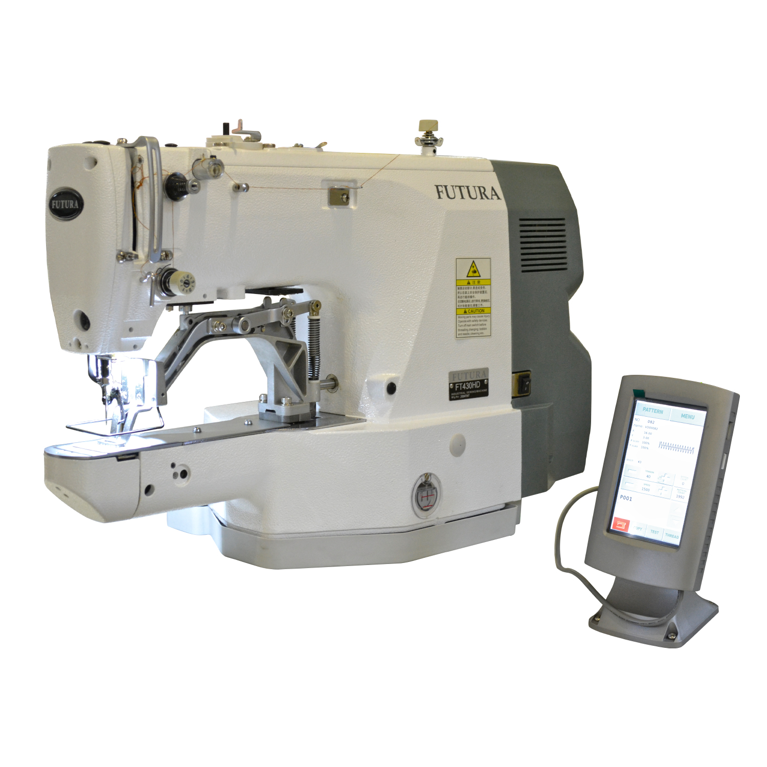 Máquina Presilladora de doble pespunte, costura recta electrónica programable con 87 diseños de presillas predeterminados, motor integrado al cabezal, panel de control y corte de hilo.