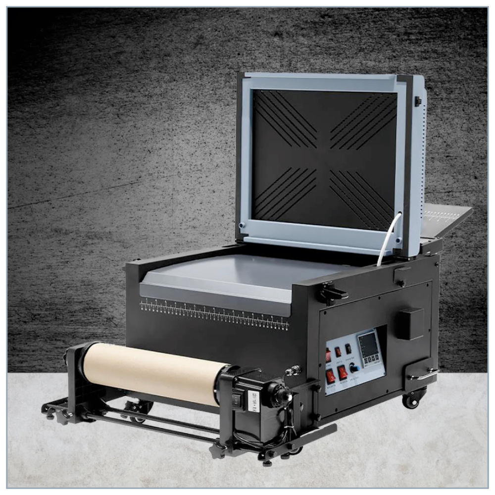 Con el calentamiento de la platina inferior para un curado uniforme y consistente, y un purificador de aire integrado, este agitador facilita la aplicación de polvos en sus transferencias DTF.
